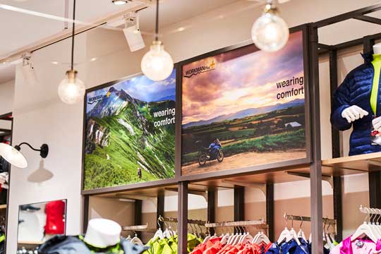 レインウエアの「AESIS(イージス)」、アウドドアの「Field Core(フィールドコア)」、スポーツウエアの「Find-Out(ファインドアウト)」が代表的な3ブランド。お店の柱には、その3つのロゴがデザインされています。