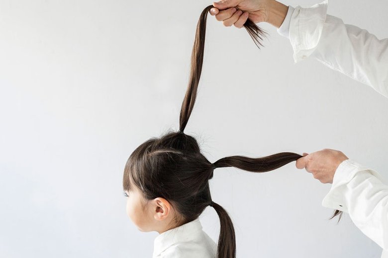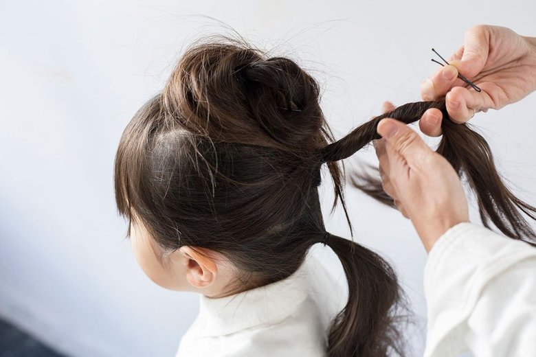 実は髪の毛をまとめるときにもコツがあります。 「お子さんには、あごをあげてもらい、上を向いてもらった状態で結びましょう。そうすると、襟足部分がぽっこりと出ることなく美しいラインでまとめることができますよ」 また、毛のブラシを使ってまとめると静電気が起きづらく、表面がキレイに仕上がるそう。