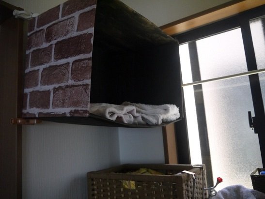 壁に穴はあけられないのでかもいフックというもので段ボールを固定してタオル置き場を作ってみました。やっぱり段ボールなので何枚ものタオルは置けませんが、4、5枚なら大丈夫です。また、側面にはセリアのリメイクシートを貼っておめかししてみました。