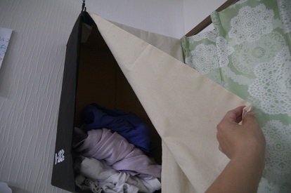 ちなみに我が家は賃貸なので壁に穴があけられないため、奥にあるカーテンレールとシェルフをS字フックで引っかけるようにして固定しました。また、それだけでは安定しないので天井に押しピン(天井は穴を開けても目立たない素材だったので)でチェーンを固定し吊り下げるようしています。壁に穴を開けても大丈夫なおうちの場合は段ボールの壁が接している面にビスで穴を開けて固定するのが一番簡単だと思います。そしてこの中にたたんだ服を一時的に置いておくようにしています。もちろん段ボールなのでたくさんの量は入りませんが大人の服なら4、5着は入るので夫婦の服やタオルなどを置いておいて夕食作りなどを終えて時間の余裕ができたら収納にしまうようにしています。