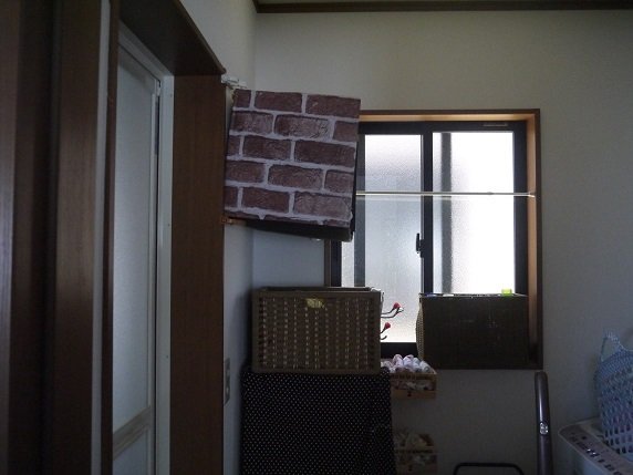 思いつきで作ったこちらの段ボールシェルフですがなかなかの優れものです。まずは材料費ですが段ボールと画用紙(または絵の具)、あとは固定する道具(ビスや押しピンなど)だけなので500円もかかりません。木材を使って本格的に作ろうとしたら材料費が結構かかりますよね。作るのもとっても簡単です。段ボールってばれないように画用紙や絵の具で色を塗るだけです。壁に接している面などは見えないので画用紙を貼る必要なしです。そして軽くて丈夫なので簡単に固定することができます。つけ外しが楽なので作ってみたもののあんまり使わなくなった!って時はすぐに外せます。そして、一番の利点は好きな高さで設置できるということだと思います。衣類の収納場所ってどうしてもタンスやかごの中など床に設置した状態での収納になってしまいます。こちらの段ボールシェルフは壁に収納するような形なので設置しても部屋は狭くなりませんし、目線の高さにすれば出し入れも楽ですよ。私の場合は洗濯物の一時置きで作りましたが、日常のちょっとした物の収納場所として活用法はいろいろあると思います。私は同じ発想で洗面所のバスタオル置きを作ってみました。先ほど話した通り我が家は賃貸なので洗面所などの収納も少なくてバスタオルを置く場所もないです。しかも3人の子供たちを私一人で一度に入浴させるのですぐにバスタオルが取り出せるようなシェルフが欲しかったのです。作ったのはこちら、真ん中のレンガ柄のものです。