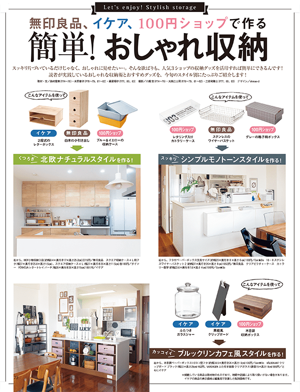 スッキリ片づいているだけじゃなく、おしゃれに見せたい…。そんな欲ばりも、無印良品、イケア、100円ショップの収納グッズを活用すれば簡単にできるんです!読者が実践しているおしゃれな収納術とおすすめグッズを、今旬のスタイル別にたっぷりご紹介します!ただ整理するだけではなくて、インテリアもおしゃれにしたい! そんな願いを叶える夢の収納特集です。北欧ナチュラル、シンプルモノトーン、ブルックリンカフェと、2016年最旬のインテリアスタイル別にワーママさんの実例宅をピックアップ! すぐに真似できるテク満載のスッキリ&おしゃれな家をボリュームたっぷりに紹介します。詳細は、CHANTO10月号をチェック!【CHANTO10月号の目次はこちら!】