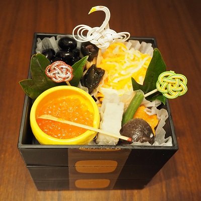 写真:地味な色合いの料理を詰めた重箱には、水引ピックで華やかさをプラス。