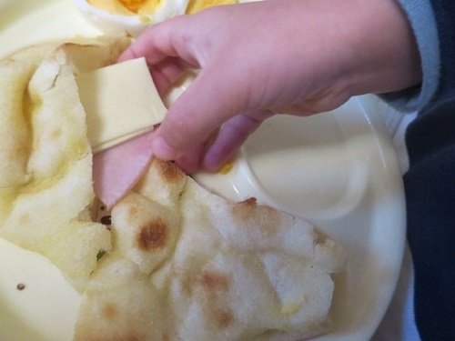 さて、ナンも手に入ったらごはんの準備をしましょう。ポイントはナンの切り方。ポケット型になるように切ると子どもも具材を挟みやすいので、上手にナンの曲線を生かしてなるべくたくさんのポケットがとれるように切ってください。サンドイッチって子どもにとっては意外ときれいに食べるのが難しいんですよね。子どもサイズに合わせて切ったポケットをお子様へ。真ん中のポケットにならなかった部分を大人に回すのがおススメです。 せっかく包丁を出したこのタイミングで、ハムとチーズも適当なサイズに切っておきます。 ゆで卵もむいて輪切りに。卵サラダにする分はフォークの背でつぶしてマヨネーズと黒コショウを和えておけば準備は完了です。