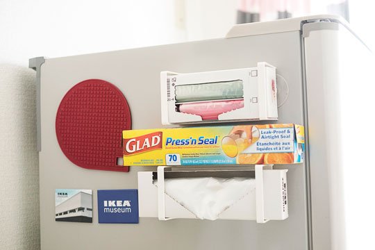 イケアのプラスチック袋をすっきりと冷蔵庫脇に収納してくれるのは「GLÖMSTA プラスチック袋ホルダー 吸盤付き 399円(税込)」。 「よく使うサイズのプラシチック袋のみ、ここに収納しています。柄のかわいいパッケージを並べることで、海外のような雰囲気になるのもお気に入りです」 ちなみに、イケアのマグネットはお土産でいただいたものだそう。