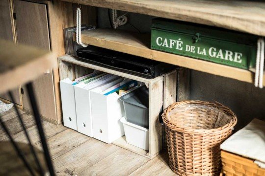 ウッディな雰囲気の雑貨のなかでひときわ目立つホワイトのファイルボックスのなかには、娘さんの宿題関係のものを入れているそう。 「このホワイトが映えるので、視認性が高いんです。“あっ、宿題やらなきゃっ”てなります(笑)」