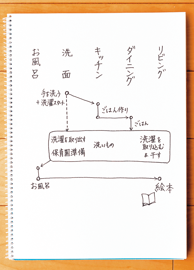 帰宅後のスケジュールを洗面室、キッチン、リビングなど部屋ごとに時系列で書き出し、動線を"見える化"。ムダな動きを洗い出し、効率的な手順を思案した。「洗濯開始は前倒し、洗濯もの干しや昨夜の洗濯もののとりこみ、洗いものはまとめてすませることに。仕事でも実践中の"減らす・まとめる・順序の変更・簡略化"を心がけました」