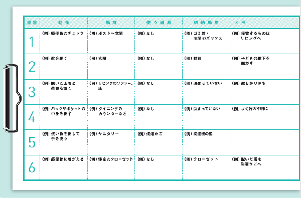 自分なりの「ただいま5 分」習慣をつくるために、まずは普段、無意識にしている帰宅後5 分の行動を書き出して、散らかる原因や場所を把握しましょう。それをもとに動線を整理すれば、ムダのない習慣ができます。