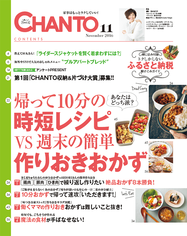 キッチン、リビング、浴室、トイレ、洗面所、玄関と場所別に目からウロコの掃除術をていねいに解説! 松橋さん愛用の掃除グッズも必見です。 年末の大掃除に向けて、ぜひ参考にしてくださいね。 詳しくはCHANTO11月号をチェック!