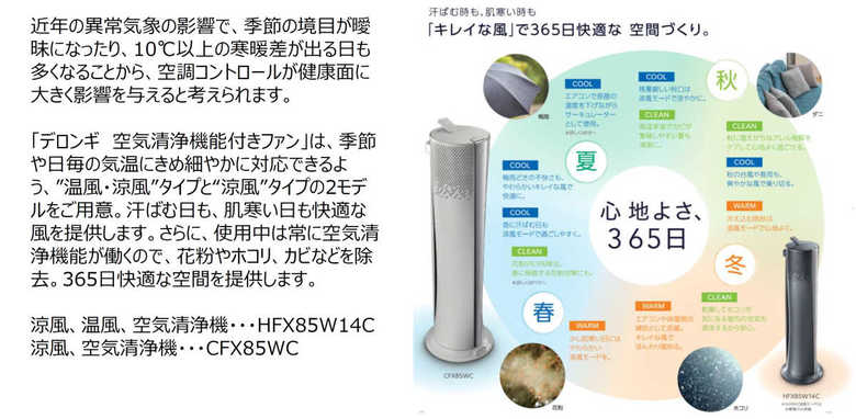 同商品は季節や日ごとの気温にきめ細やかに対応できるよう、“温風・涼風タイプ”と“涼風”タイプの2モデルを用意。快適な風を提供しながら、空気清浄機能で花粉やほこりなどが除去できます。理想的な風が流れる、くつろぎの空間をコーディネートしてはいかが?