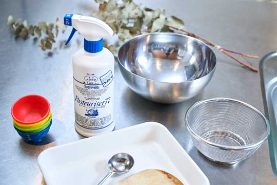 衛生的に最も気をつけたい調理器具全般の除菌も、パストリーゼがあれば安心。使う前に全体に行き渡るように噴霧しましょう。