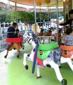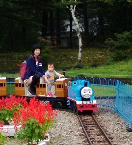 子供は運転席のついたキッズトレインやトーマス、メリーゴーランドに「ちびっこ宝島」(ぐるぐる回るコーヒーカップのようなアトラクション)などを初体験。