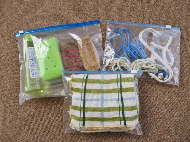 洗剤やフキンなどこまごました消耗品類の整理には、キッチンでもおなじみのジッパー付バックが役立ちます。キャンプ場では、輪ゴム、ビニール袋、洗濯バサミ、S字フックなど、小さいものの出番が意外と多いもの。細かいグッズは散らかりやすいで、写真のようにケースを利用してまとめておくと管理がしやすくなります。 キャンプ場ではできるだけゴミを減らしたいので、買った物はそのまま持参せず、先に包装を取り除いてセットしておくといいですよ。