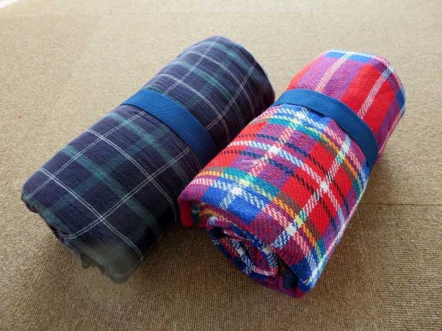 毛布などの布物は、丸めると崩れずコンパクトに収まります。100均でも売っているマジックテープ式のバンドや太めのゴムなどを利用しましょう。丸める収納で車に積むと荷物の隙間にも入れやすく、持ち運びも便利です。