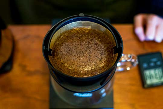 1投目は30秒程の蒸らしが重要ですが、2投目以降は最初の蒸らし時間によりガスが抜け湯の通り道ができている状態なので、蒸らしはせずとも、あふれない程度で連続して湯を入れて大丈夫だそう。