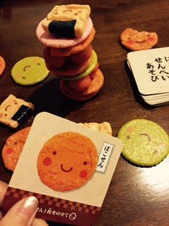 お箸の練習にもなる、『ニコ せんべいあそび』もおススメです。遊び方は何通りかあるのですが、一番簡単で盛り上がるのが、引いた種類のおせんべいを積んでいくバランスゲーム。本物のおせんべいのように、表面がでこぼこしていていたり、かけたおせんべいや、おかきなど大きさが違うものがあったりと、不安的で難易度がアップするものもあって、当たったカードによっては、ドキドキ感が味わえます。手で積んでもよいのですが、箸を使うとさらに難易度アップ!