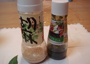 冷蔵庫に何本か入っているドレッシング。いろんな味を試しているうちに残りわずかなドレッシングが数本溜まっていました。特にお気に入りの胡麻ドレッシングは大きなビンで幅を取っていました。この際、サラダのドレッシングは手作りしてみようと数日続けたところ、酢・オイル・レモン・塩コショウ・醤油・マヨネーズがあれば大体のドレッシングはできることがわかりました。胡麻ドレッシングはポン酢とマヨネーズ、すりごまでおいしくできました。写真のような分量付きカップがあったのでその日のメニューに合わせてお手軽に作っています。冷蔵庫もすっきりしてきました。
