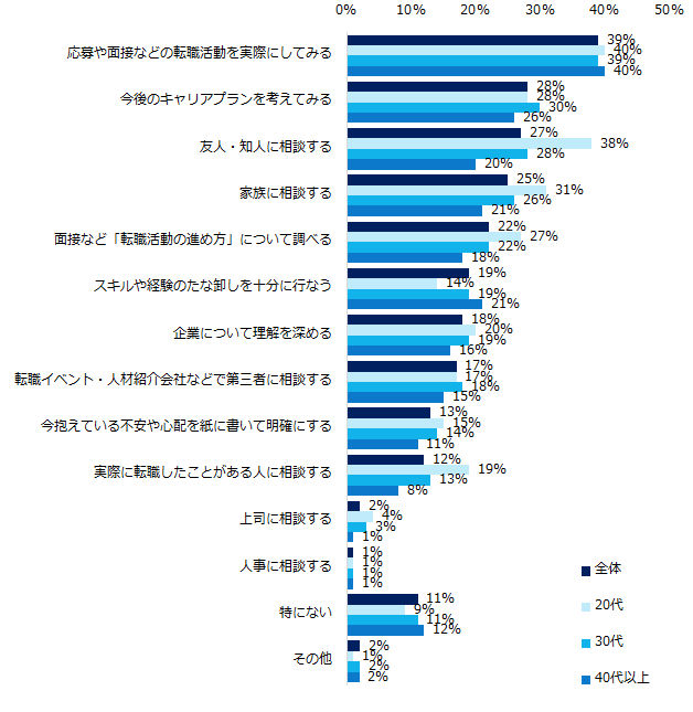 「実際に転職経験したことはありますか?」と聞いたところ、69%が「ある」と回答しました。転職経験者に、「不安な点・気になる点があった場合、実際にどうやって解消しましたか?」と質問。最も多かった答えは「応募や面接などの転職活動を実際にしてみる」(39%)、次いで「今後のキャリアプランを考えてみる」(28%)、「友人・知人に相談する」(27%)でした。年代別に見ると、20代は他の年代に比べて「友人・知人に相談する」(38%)、「実際に転職したことがある人に相談する」(19%)が高い傾向に。