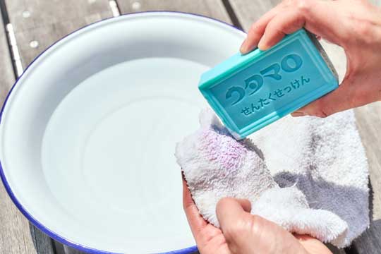 ガンコな汚れには、ウタマロ石けんを汚れた部分に直接塗って、繊維の奥に入り込んだ汚れとなじませることが大事です。