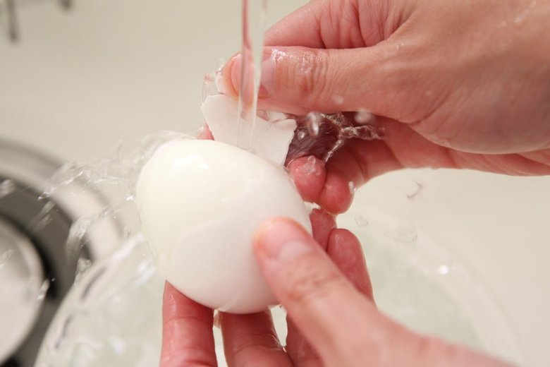 →流水にさらしながら、白身と卵膜の間に流水を入れるようにすると、つるっと剥けやすくなります。