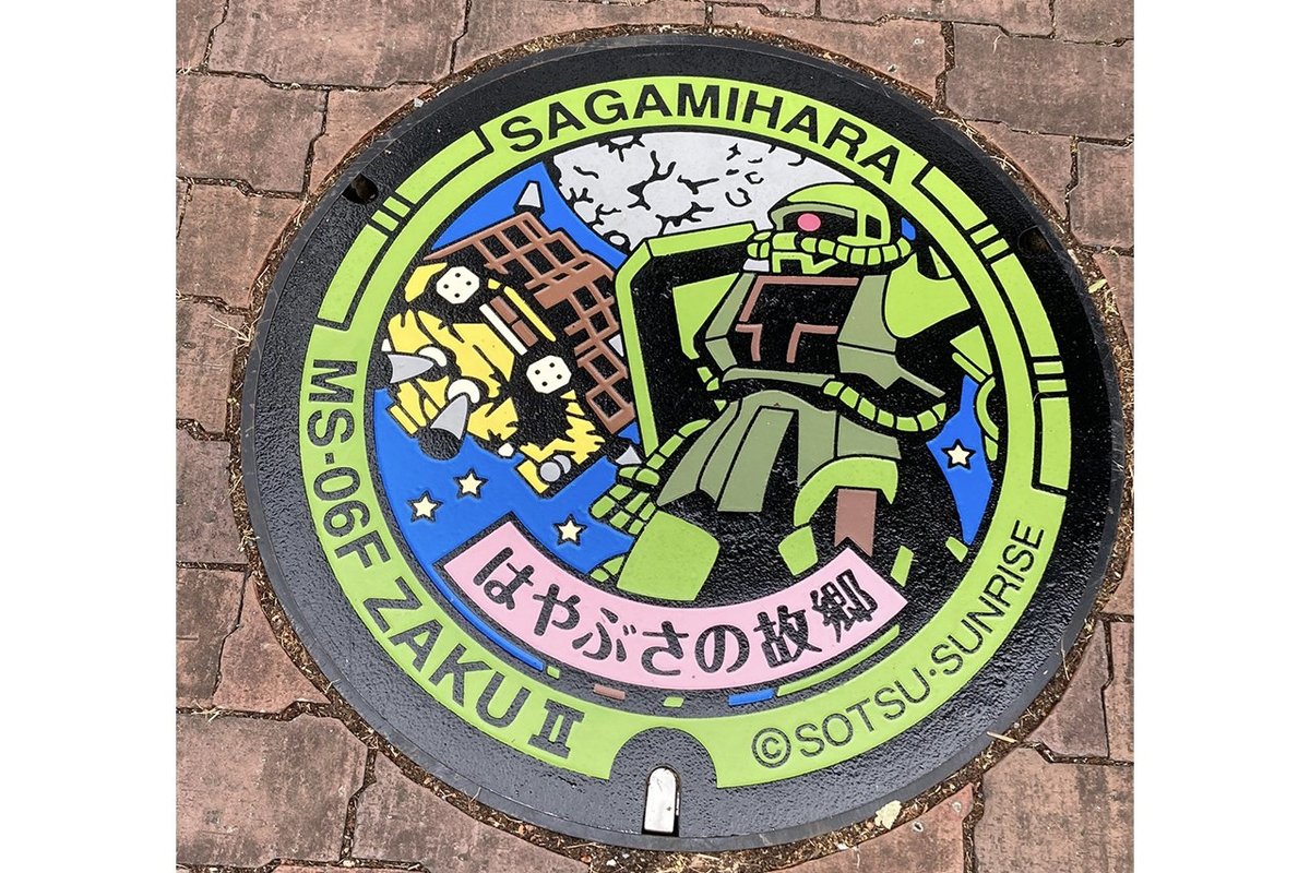 神奈川県/相模原市のJAXA相模原キャンパス正門前(神奈川県相模原市中央区由野台3丁目1ー1)設置されたばかりのザクⅡマンホール(c)創通・サンライズ