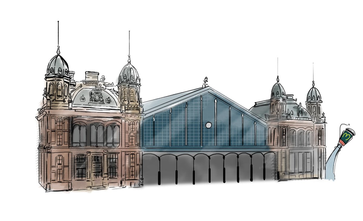 世界一美しいマクドナルドと呼ばれるハンガリー・ブダペストにある駅舎内店舗をイラストで描いて作品