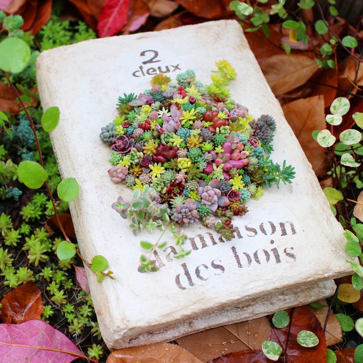 遺跡の中から発掘した本にセダムが生えていた様子をイメージ