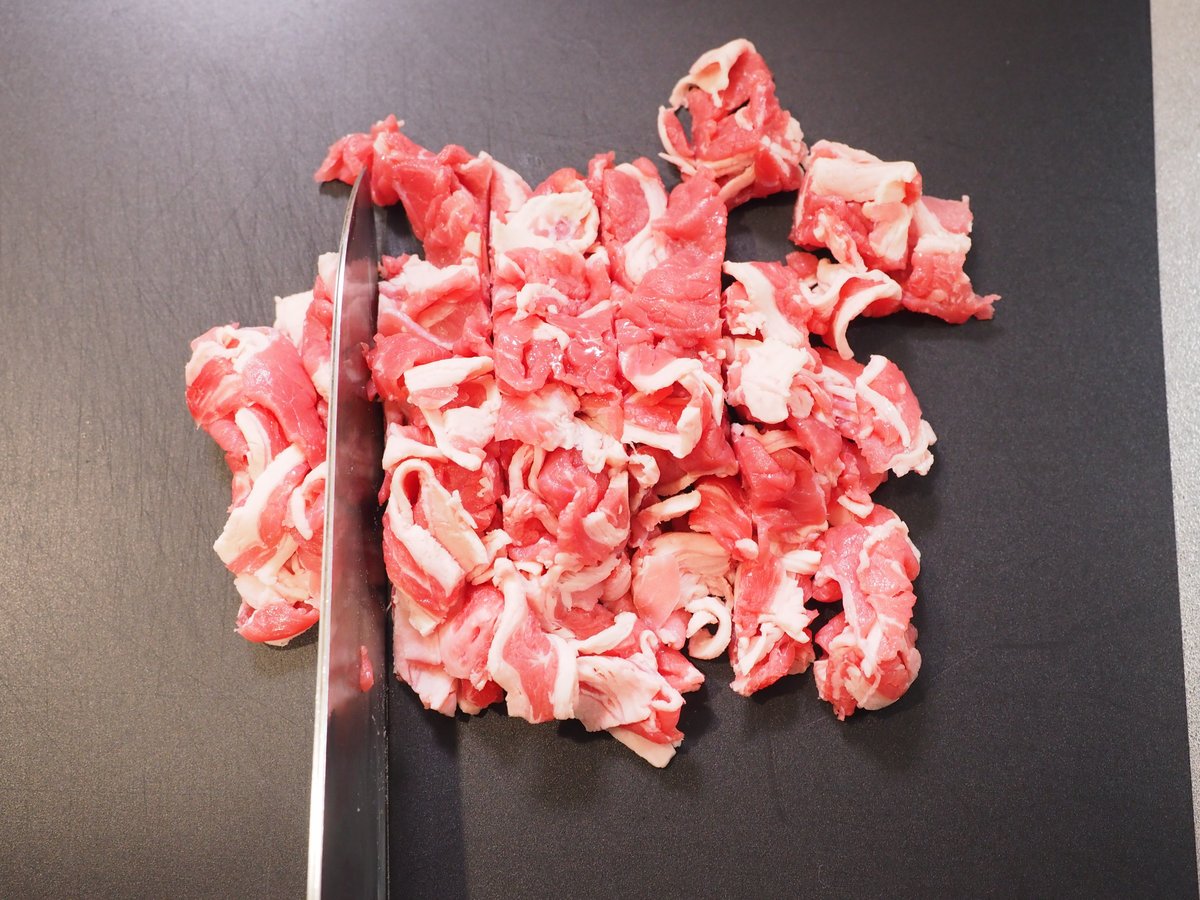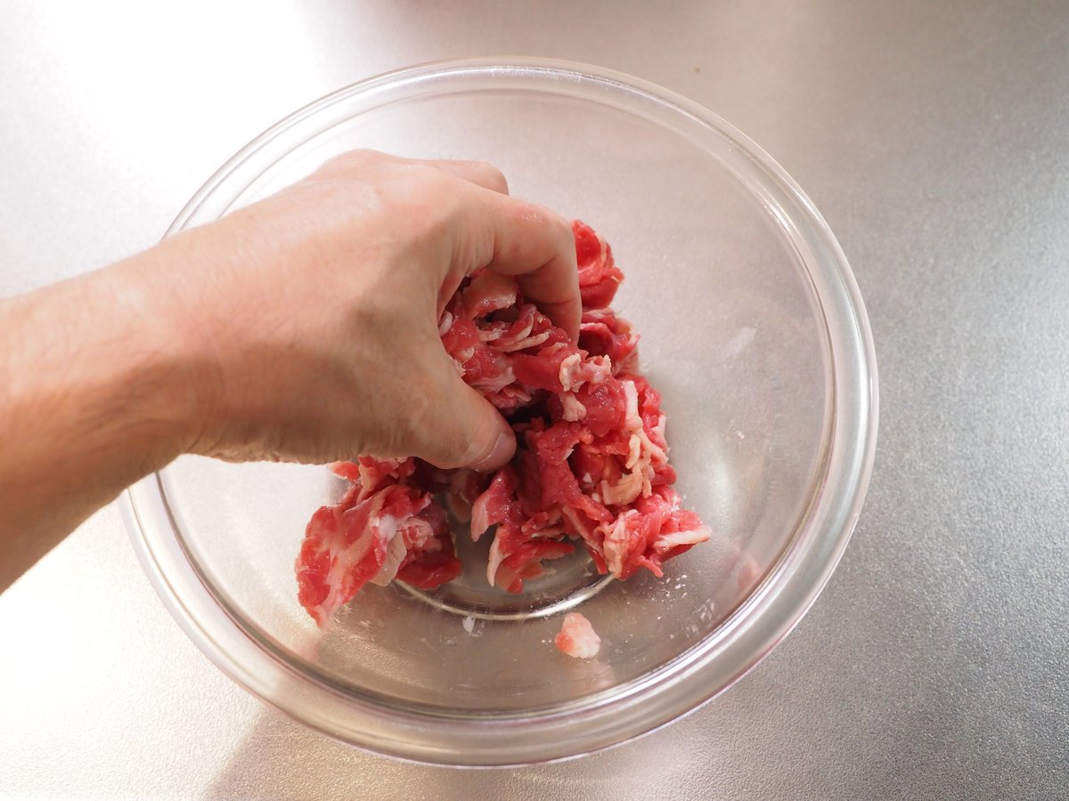 【「肉吸い風とたまごかけご飯の定食セット」の作り方】1・牛こま肉はお好みの大きさにカット
