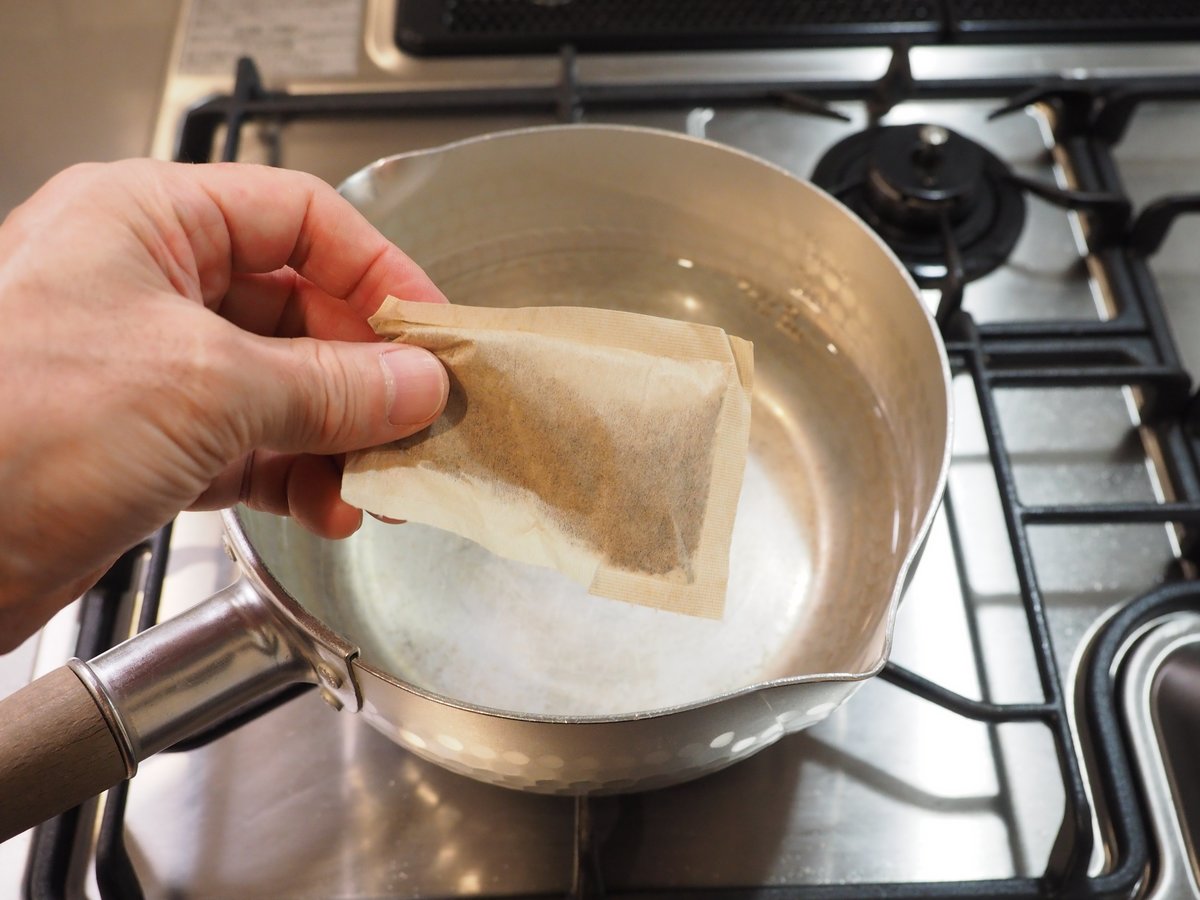 5・鍋に水650mlと出汁パック2を入れて火にかける。煮立ったら3~5分弱火で煮出す。出汁が出たら出汁パックを軽く絞って取り出す