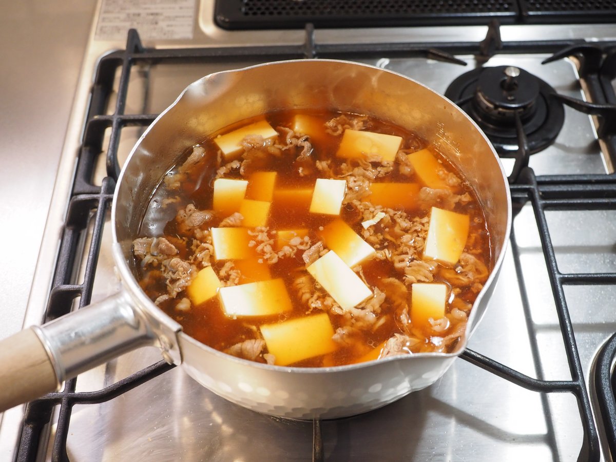 10・薄口しょうゆとみりんを入れ、塩で味を調える。豆腐を加えて温める