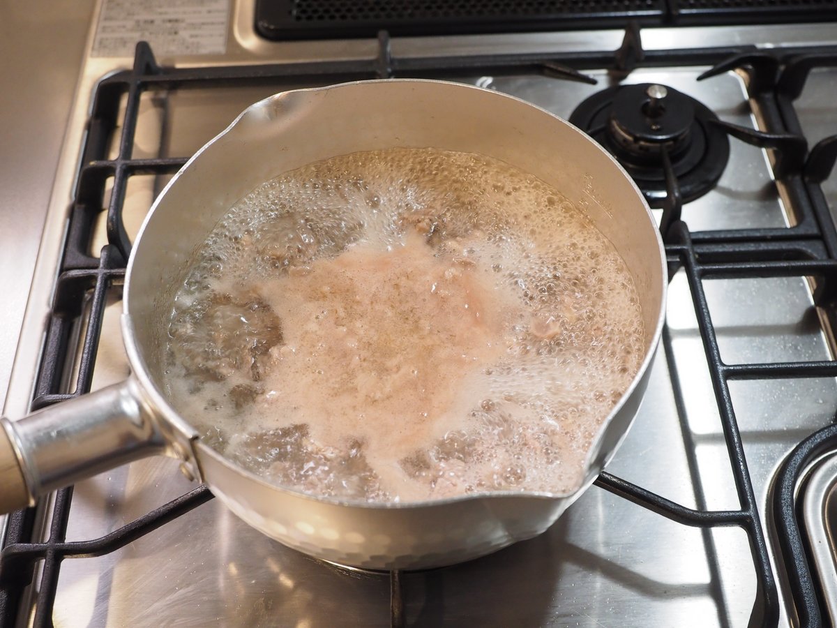 7・肉を全部入れ、アクが浮いてきたら強火で煮立てる