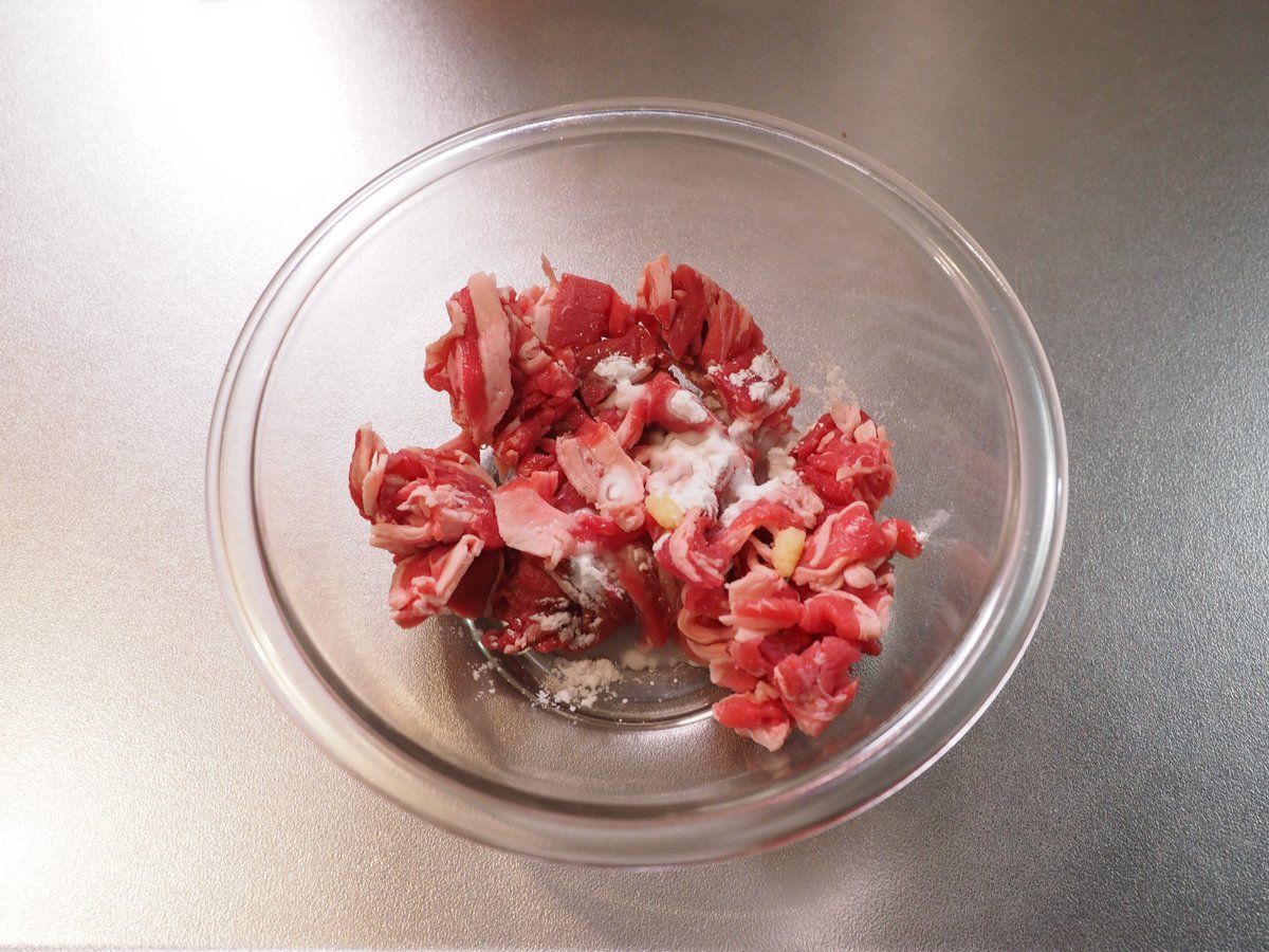 2・肉をボウルに入れて小麦粉、日本酒、おろし生姜を投入