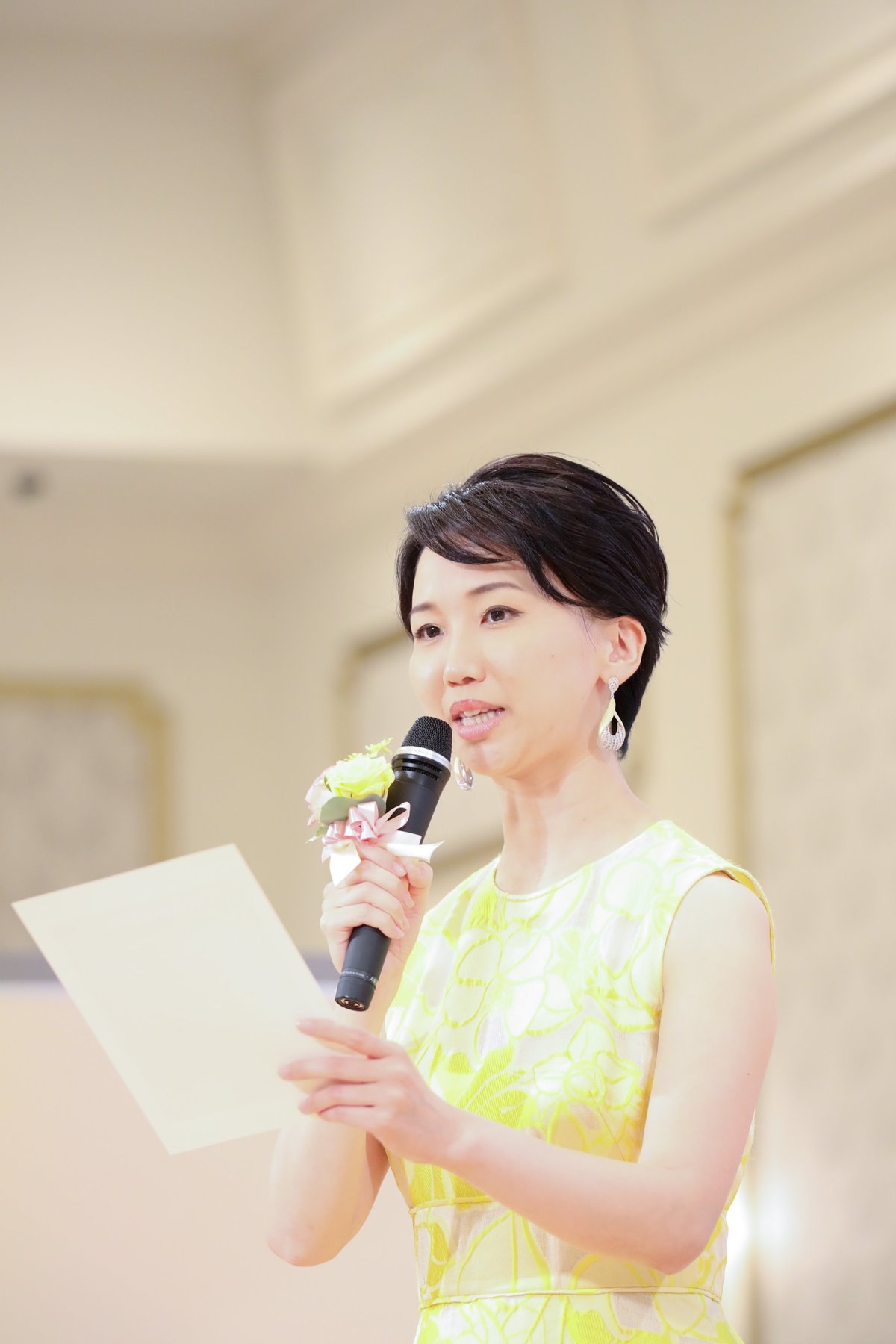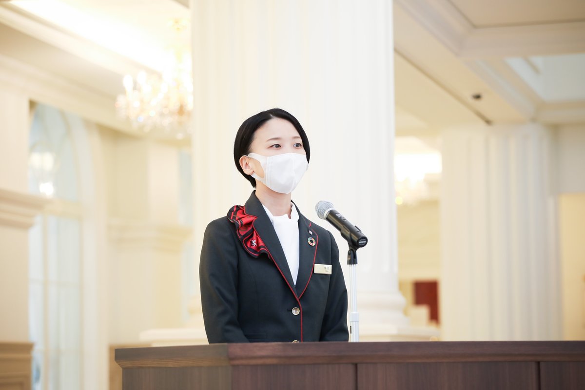 支配人として挨拶をする憧花さん。「宝塚大劇場のオフィシャルホテルとして、お客様に喜んでいただきたいです」