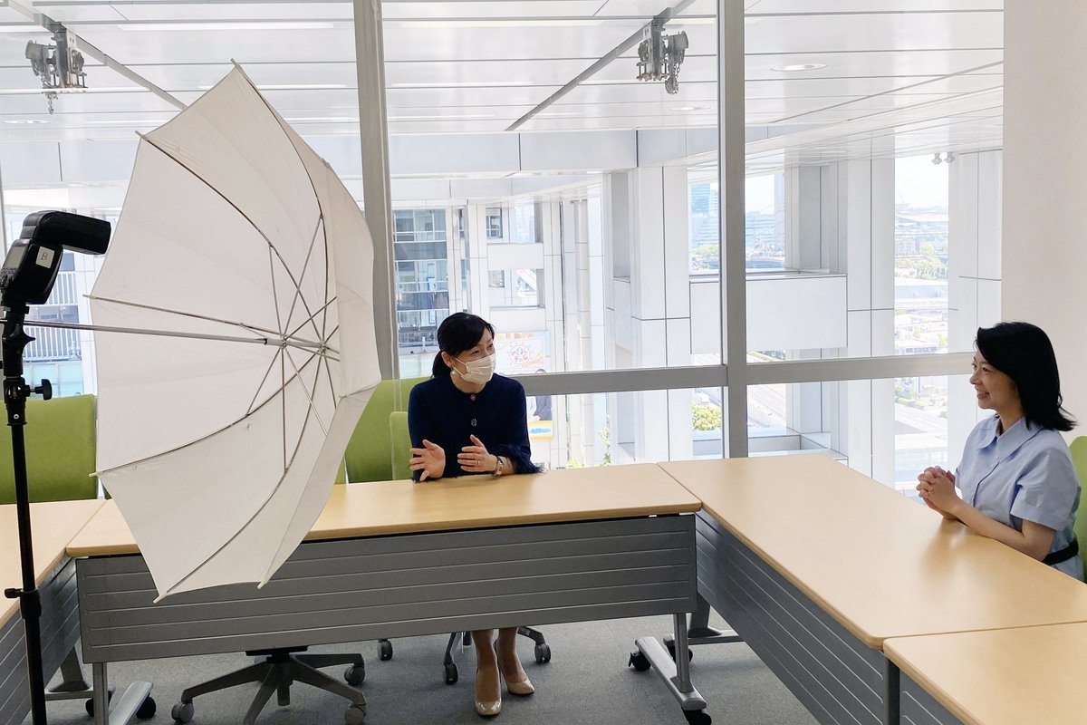 取材を受けるアナウンサーが自然な笑顔になれるよう声をかける