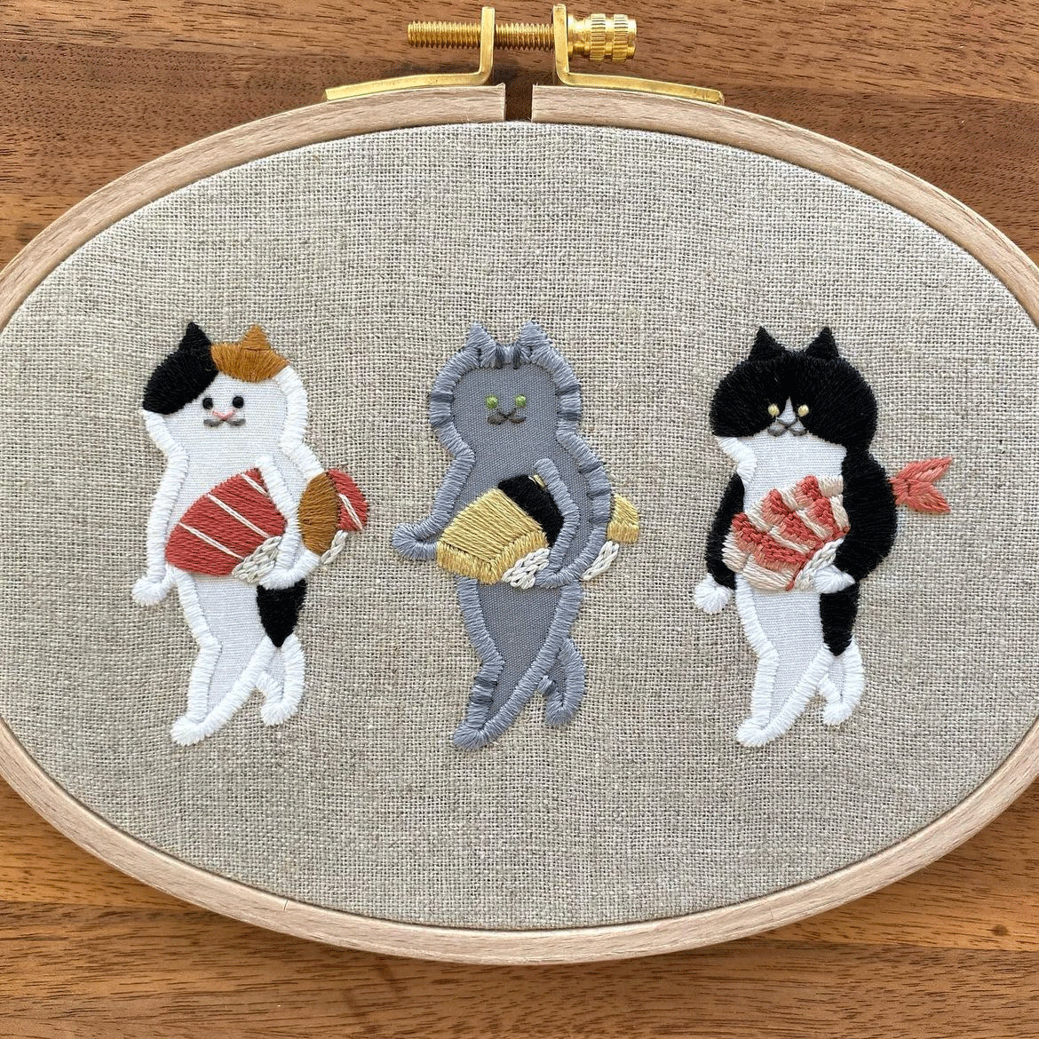 「運ぶねこ」シリーズの刺繍作品。小脇に抱えるのはなんとお寿司!?