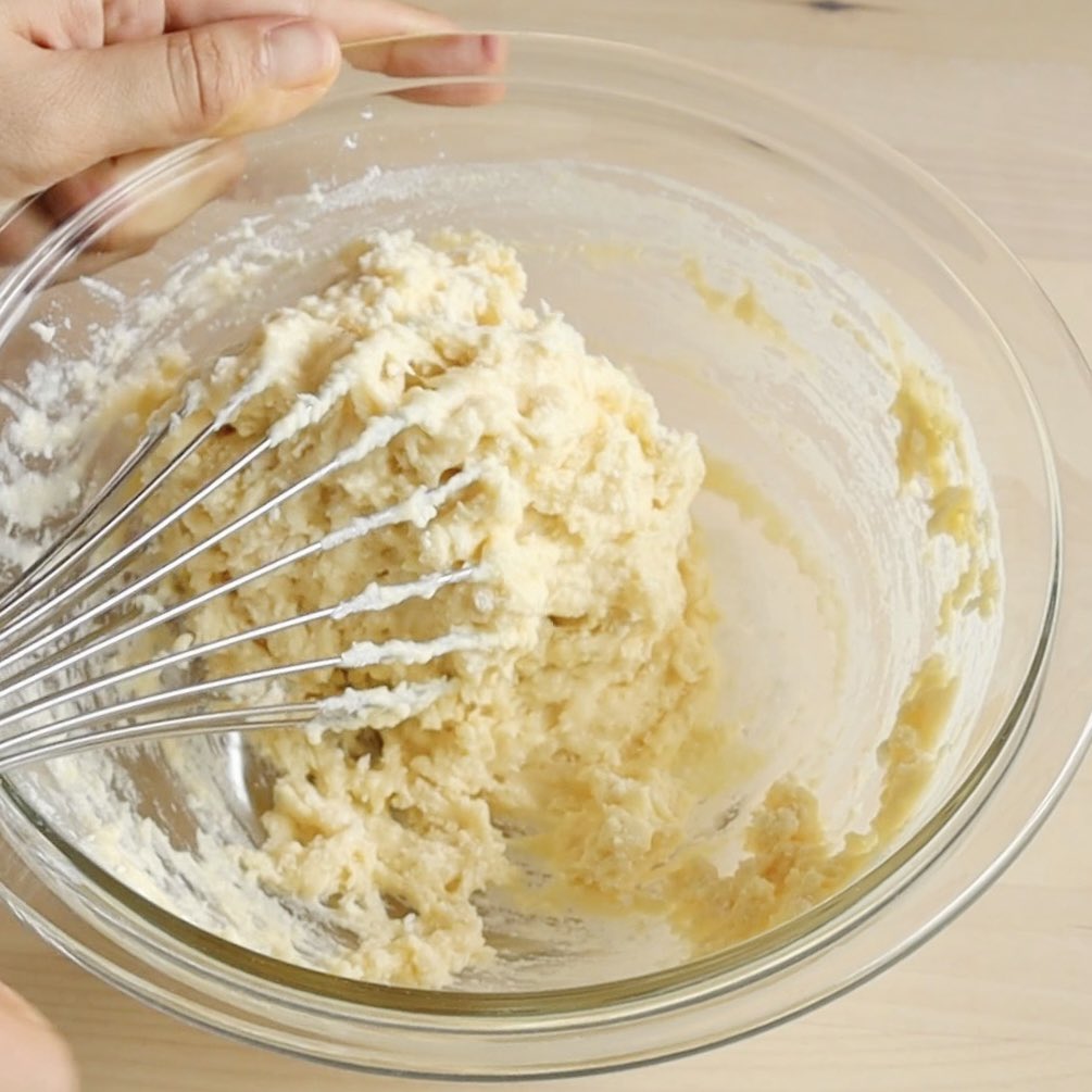【作り方】4.泡立て器で大きくすくう→落とす…を10〜20回繰り返しつつ混ぜるとよい