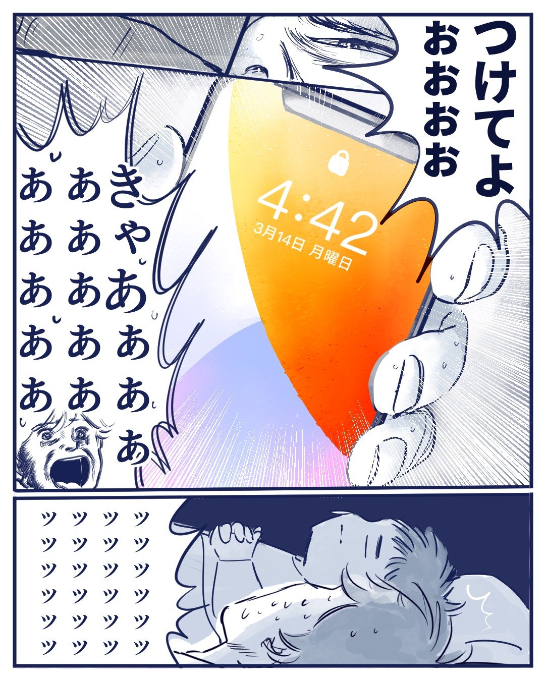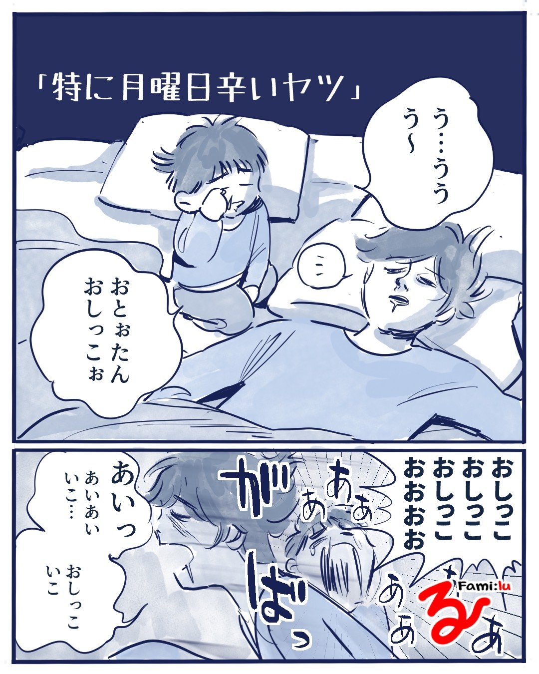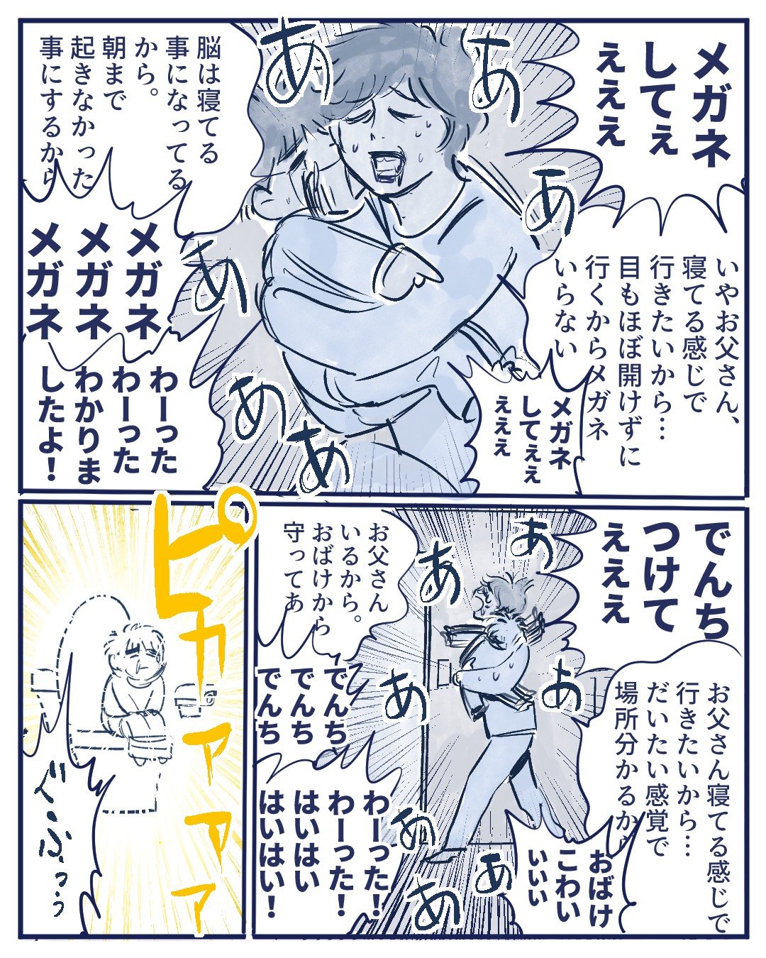 「夜中のトイレで」寝ぼけ眼の父と息子の攻防の末