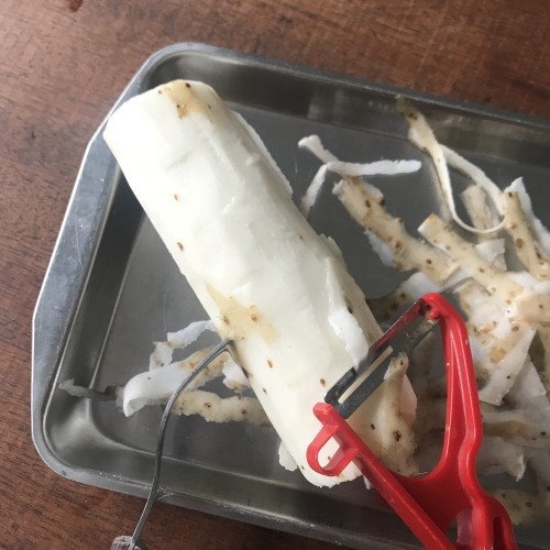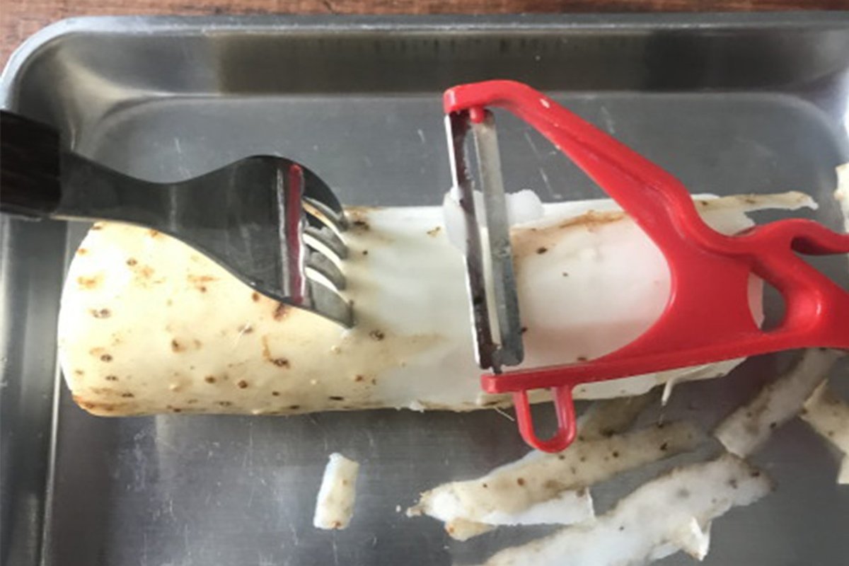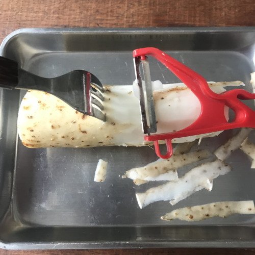 ピーラーで皮を抜くとき。フォークを垂直に立ててしっかりと長いもを固定!