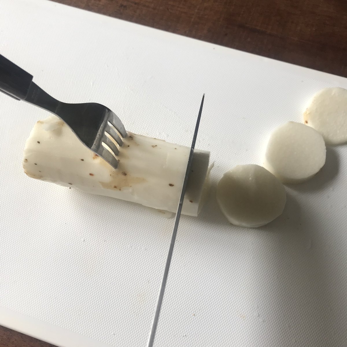 包丁でカットするとき。フォークを垂直に立ててしっかりと長いもを固定!