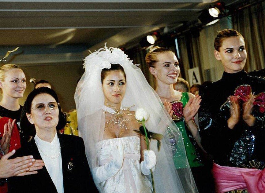 パリコレに出演した際に純白のドレスに身を包む森泉さん(写真中央)と祖母でファッションデザイナーの森英恵さん(写真左)