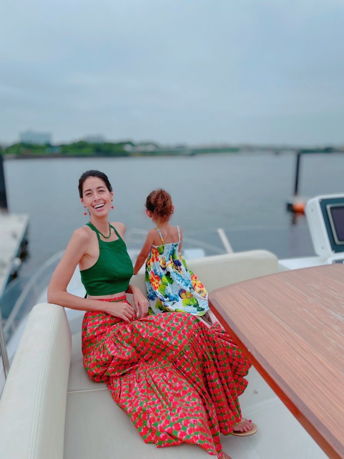 ビビットカラーのファッション姿でクルージングを楽しむ森さんとお子さん。おしゃれ!