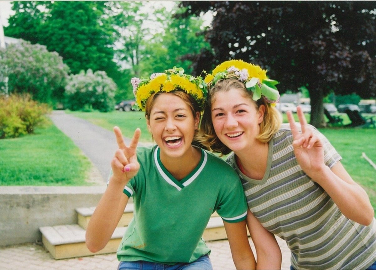 アメリカに留学中の高校生の森さん(写真左)。花冠をつけて弾ける笑顔がかわいい