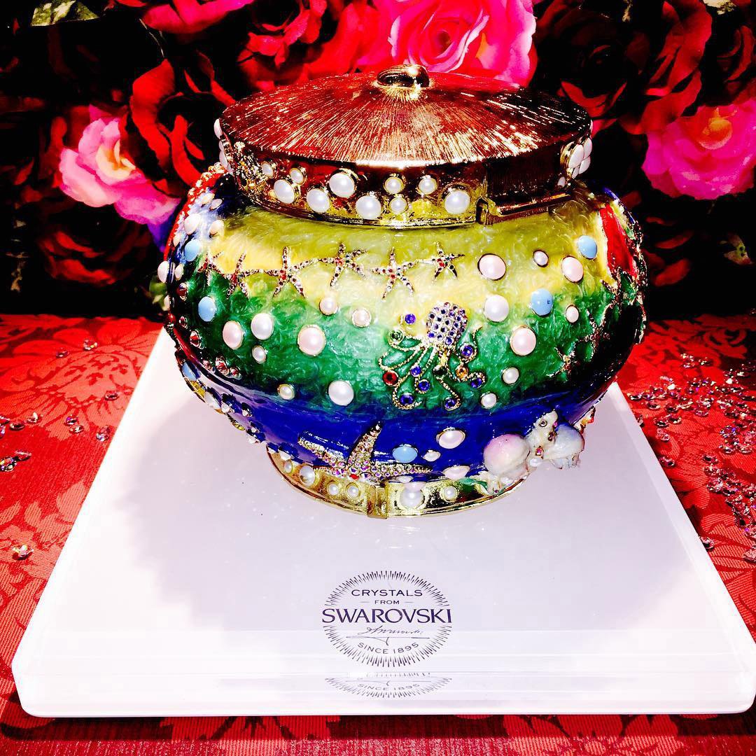 2015年のエンディング産業展に出展した、スワロフスキーをあしらった骨壺。蓋を開けると遺影が納められる