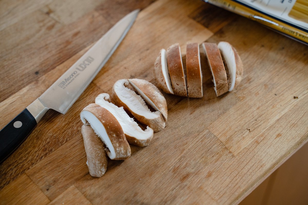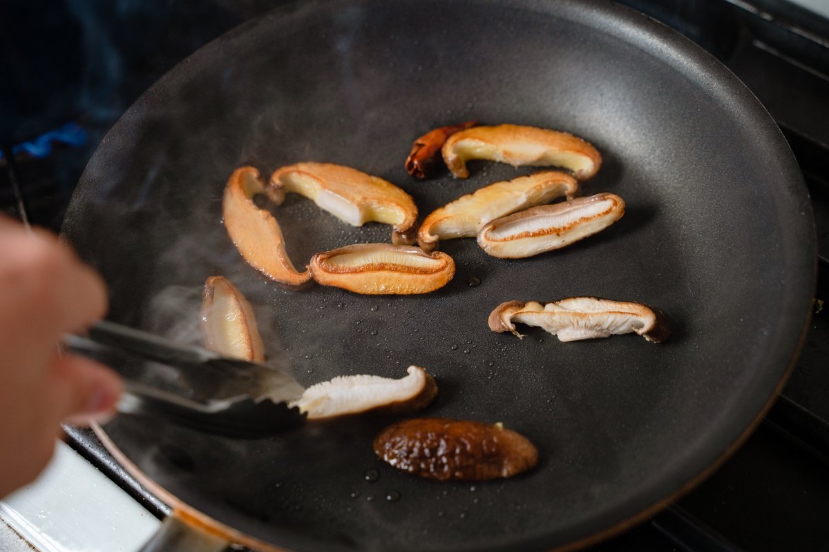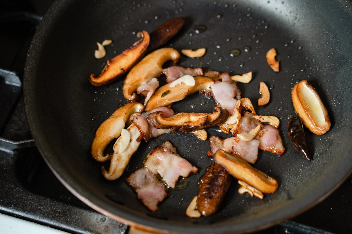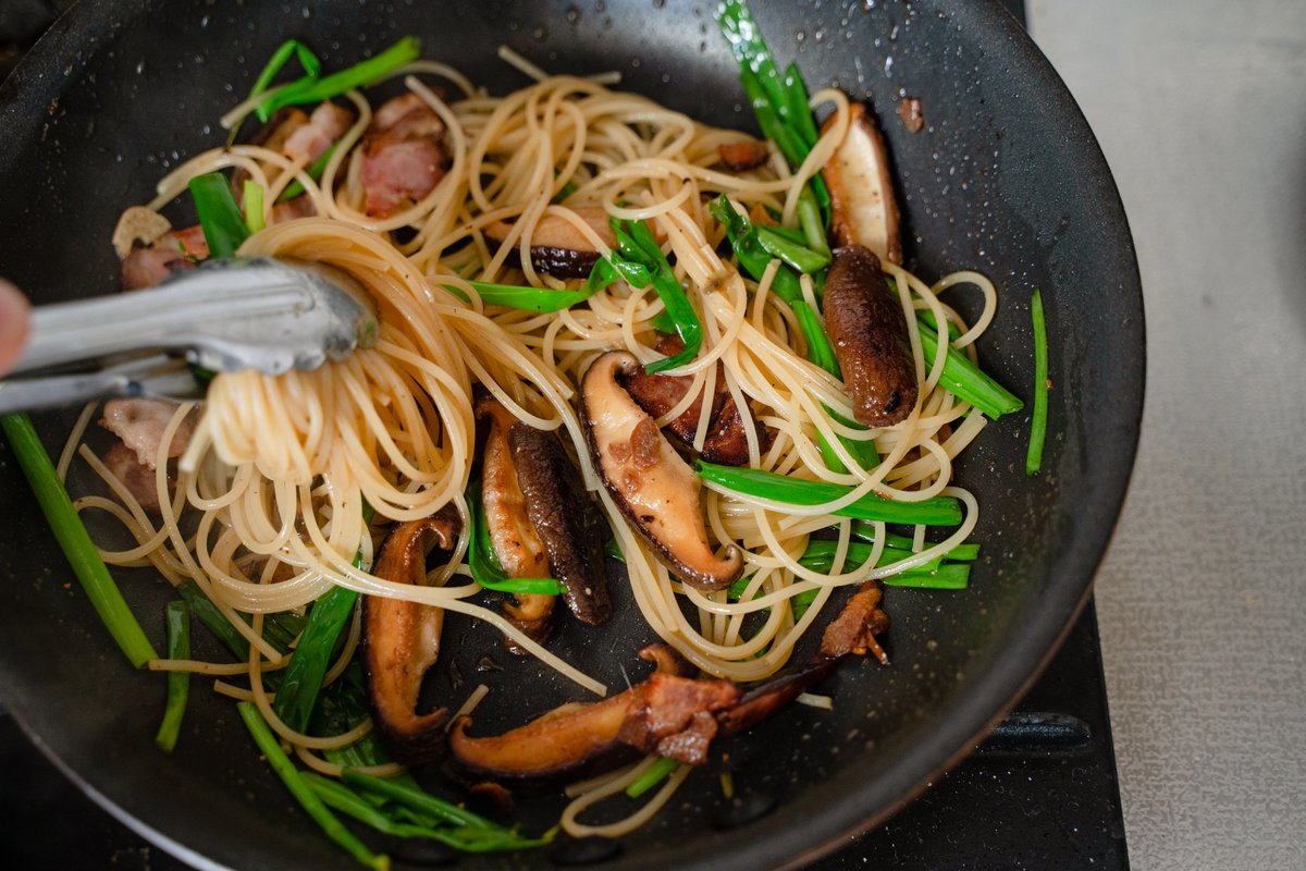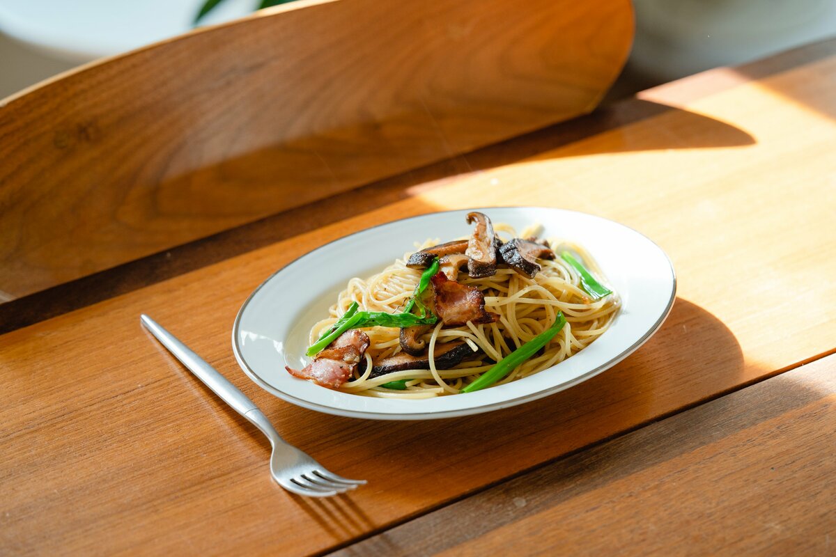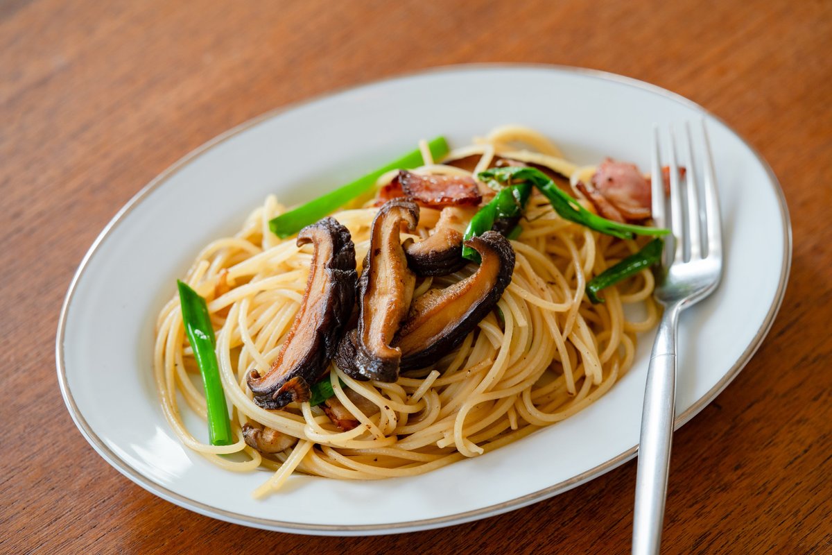 休日のランチはお家で、しいたけとベーコンのペペロンチーノ
