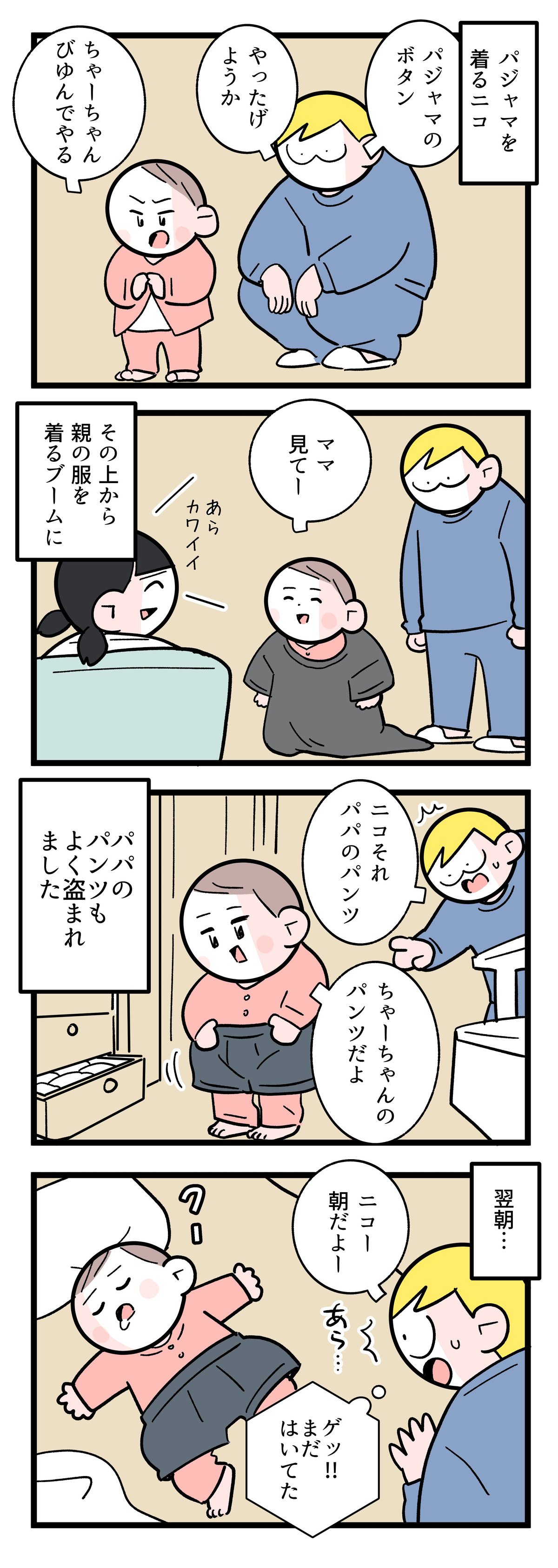 自分で着替える姿に成長を感じつつ…「ゲッ!!それは違う」