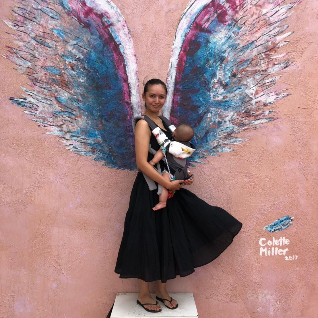 子どもを抱いて、ショッピングをしている加藤さん。車の柄の抱っこ紐が可愛い