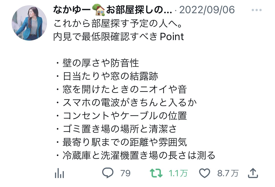 8万いいねがついたなかゆーさんのツイート「内見で最低限確認すべきポイント」