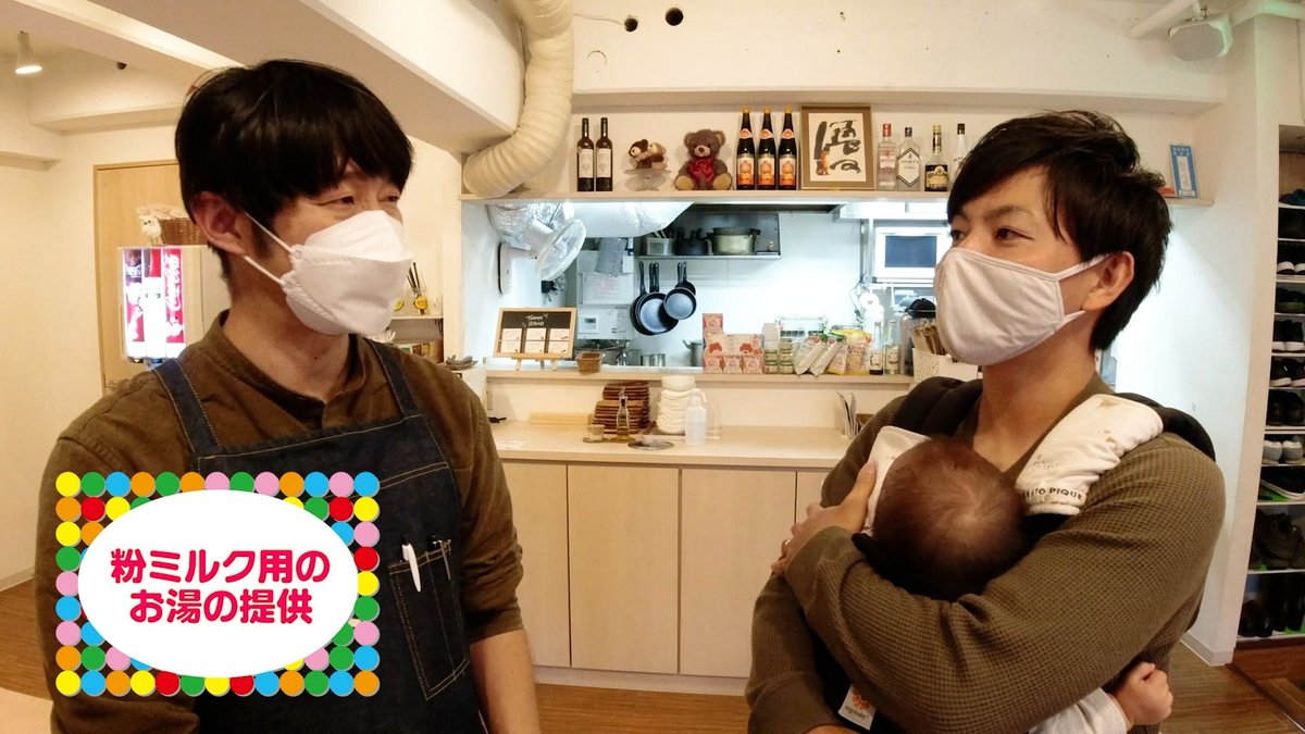乳児のための粉ミルクのお湯をもらういっちーファミリー(内閣府子ども・子育て本部YouTube動画より)