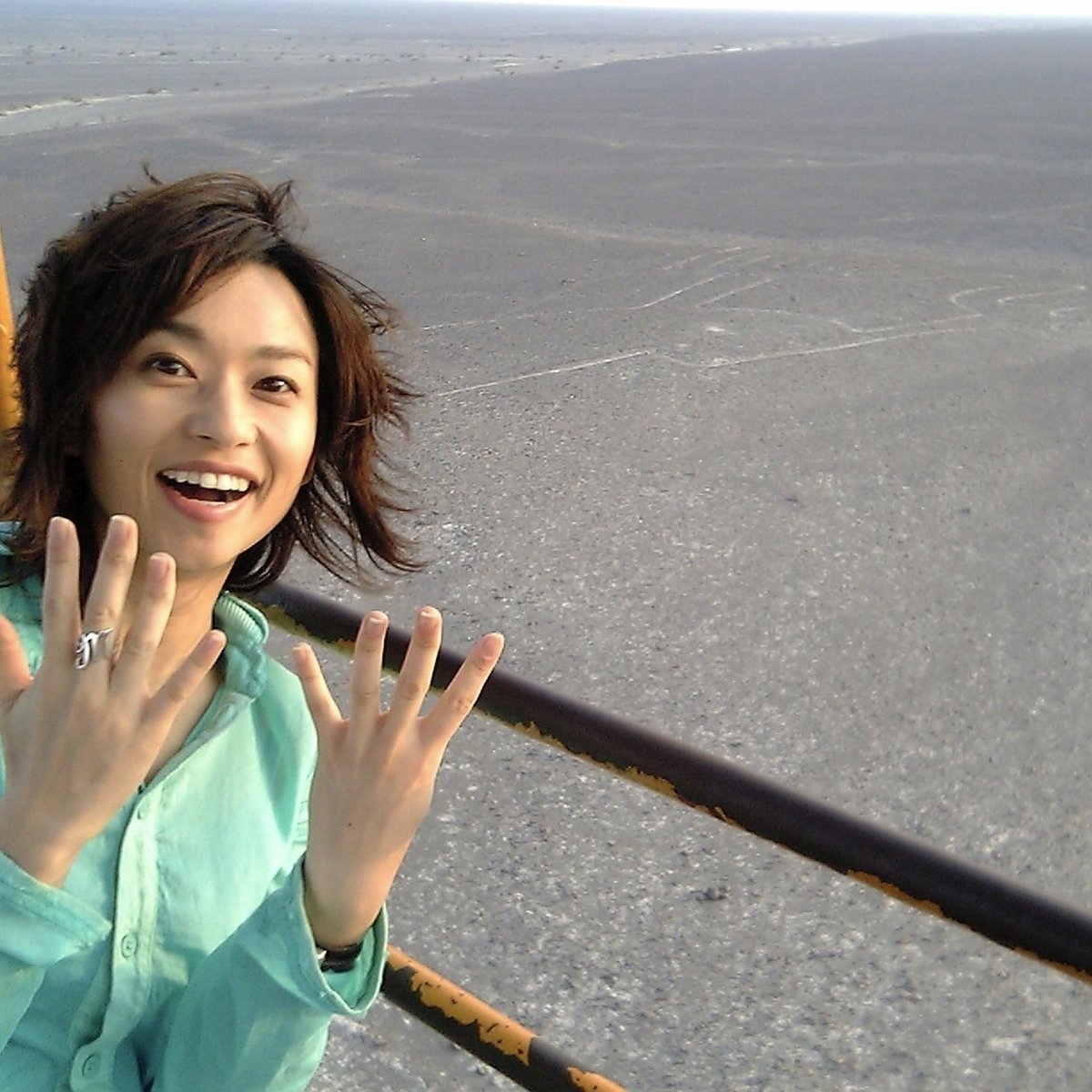 ナスカの地上絵を見下ろしながらリポートする住吉さん。語学が堪能で海外の仕事が多かったそう(写真提供/住吉さん)