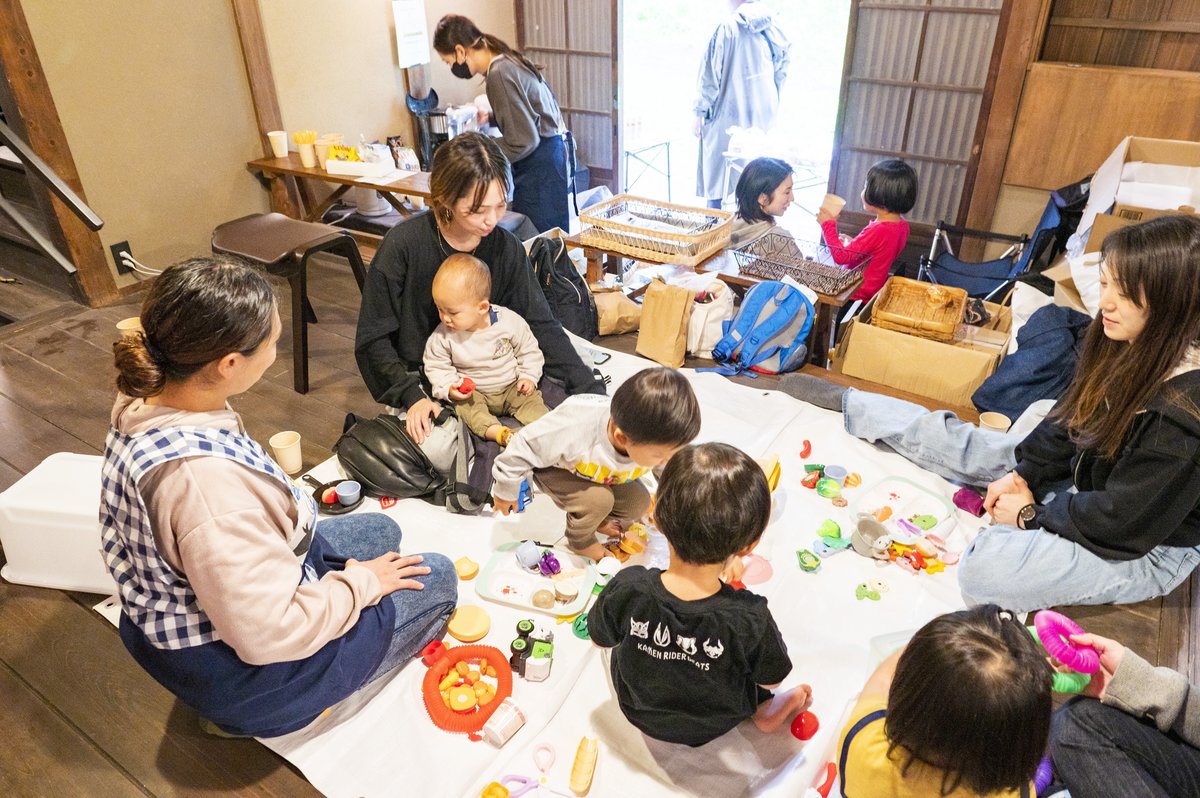 カフェのキッズスペース。この日は雨模様で室内だったが、普段は庭に張ったタープの下で